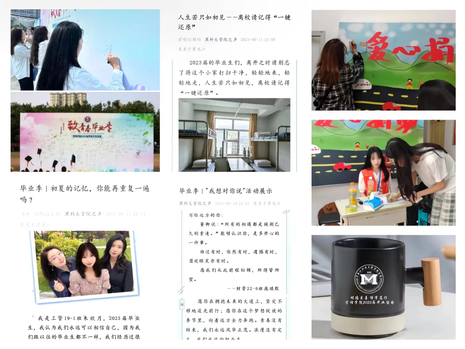 感恩--难忘母校美好时光。学院毕业生在签名墙上写下自己的名字,画上毕业表情,纪念最美好的青春年华,留下对母校的感恩之情。毕业季期间,学院开展“情随物动,爱暖人心”公益捐赠活动以及爱心捐赠,助力乡村振兴活动,充分发挥毕业生闲置物品物尽其用作用,展示了我院毕业生爱校荣校、感恩奉献的良好精神风貌。学院开展“你好,毕业季”诉说你的成长故事和离校请记得“一键还原”活动以及“我想对你说”毕业故事征集活动。同时,学院为882名毕业生精心准备定制了带有学院LOGO和院训的马克杯,从细微处提升了毕业生们的幸福感,进一步引导毕业生感恩母校、心系母校、情留母校,激发毕业生报国成才之志、爱校荣校之情、感恩奉献之心。