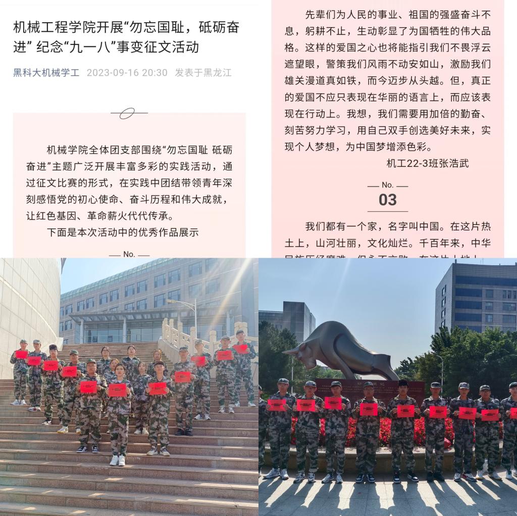 二次实践,学史增信。学院全体团支部围绕“勿忘国耻 砥砺奋进”主题广泛开展丰富多彩的实践活动,通过主题演讲、征文比赛等形式,在实践中团结带领青年深刻感悟党的初心使命、奋斗历程和伟大成就,让红色基因、革命薪火代代传承。