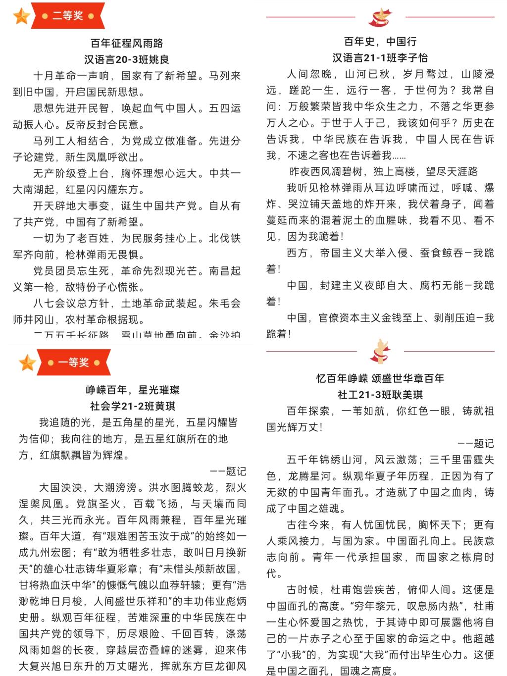 开展“峥嵘百年史 砥砺中国行”主题征文比赛。人文学子们文思泉涌,用温暖的笔触诉说至真至深的家国情怀,书写一段段动人的红色经典和中华儿女的赤子真情,透露对祖国最真诚的祝愿。本次比赛彰显了同学们爱国、爱党、爱社会主义的青春风貌,增强了同学们的社会责任感和历史使命感,引领我院青年学生为实现中华民族伟大复兴而不懈奋斗。