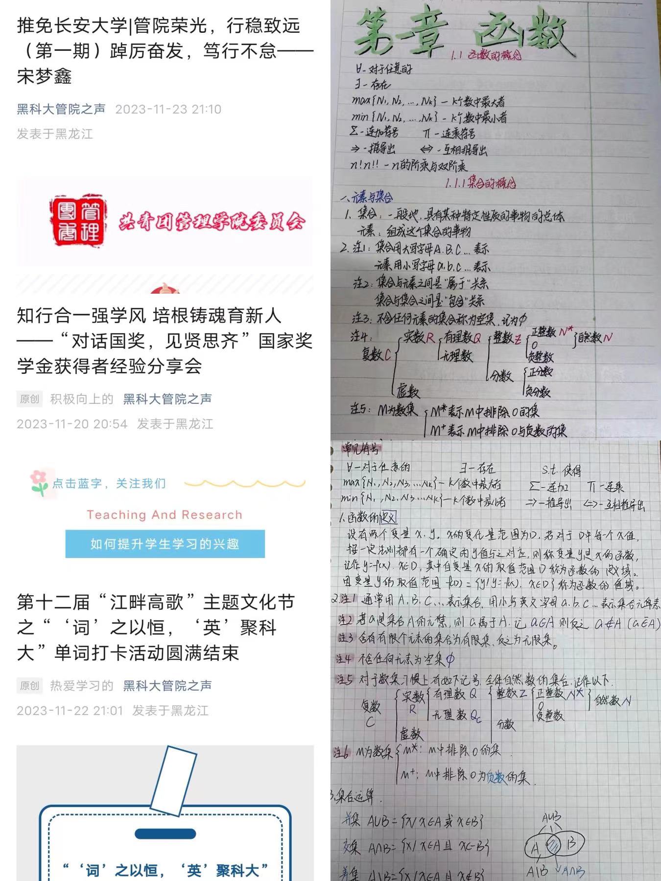 突出以智育人,发挥朋辈引领。学院充分挖掘优秀学子在学风建设中的榜样示范作用,组织开展“对话国奖 见贤思齐”国家奖学金经验分享会、“管院荣光,行稳致远”推免事迹分享活动、“四六级经验共分享,引领学习新风尚”学习经验分享会、心中有“数”,厚“记”薄发——最美数学笔记评选活动、“相约管理,牵手二三”帮扶活动、“词”之以恒,“英”聚乐鱼网站_乐鱼(中国)单词打卡等活动,发挥头雁作用,形成雁阵效应,为学生成长成才赋能添力,推动学风建设走实走深。