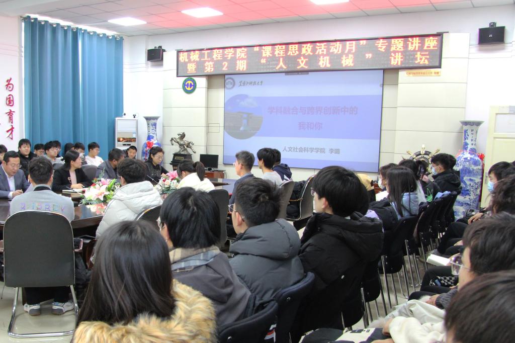 讲座伊始,由学院院长唐庆菊为李璐老师颁发了“人文机械”讲坛特聘专家聘书;之后李璐老师以“学科融合与跨界创新中的我和你”为题,从人类探索太空的步伐导入,在新工科与新文科的视域下,把人类观察事物维度的变化作为基本视角,从“加速剂”这一关键词入手,讲述了人文素养中所蕴含的人文精神、工匠精神和家国情怀的内化作用,阐释了由内而外、内外兼修的人文行为的重要性。从“减速器”这个关键词入手,以交叉学科的视角,运用创新教学的思维模式,以中国当代著名作家路遥的创作经历和代表作品的意蕴挖掘为线索,辩证地解析了“减速”与“加速”之间的逻辑关系。最后,李璐老师和现场学生进行了互动交流。