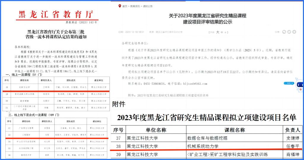 10月9日,省教育厅发布公示,王妍玮老师负责的《创新方法学》课程和冯旻老师负责的《工程图学》课程,获评第三批黑龙江省一流本科课程;12月18日,省教育厅发布公示,任春平老师负责的《机械系统动力学》课程,入选黑龙江省研究生精品课程建设项目。