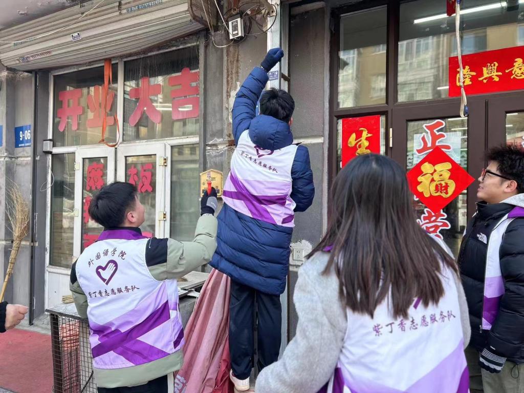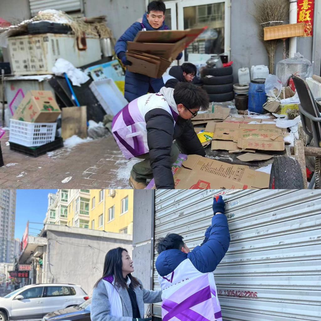 “青”心守护,美化社区环境。外院学子发扬“不怕脏”、“不怕累”、“肯吃苦”的精神,积极帮助社区清理商铺门前的垃圾和四处张贴的广告。那一抹抹身着紫色志愿服忙碌的身影,成为社区里一道靓丽的风景线。外院学子秉承“勤劳、踏实、无私”的志愿服务精神,用实际行动诠释着身为青年的责任与担当,社区居民们纷纷为这群新时代的“雷锋”们竖起了大拇指。