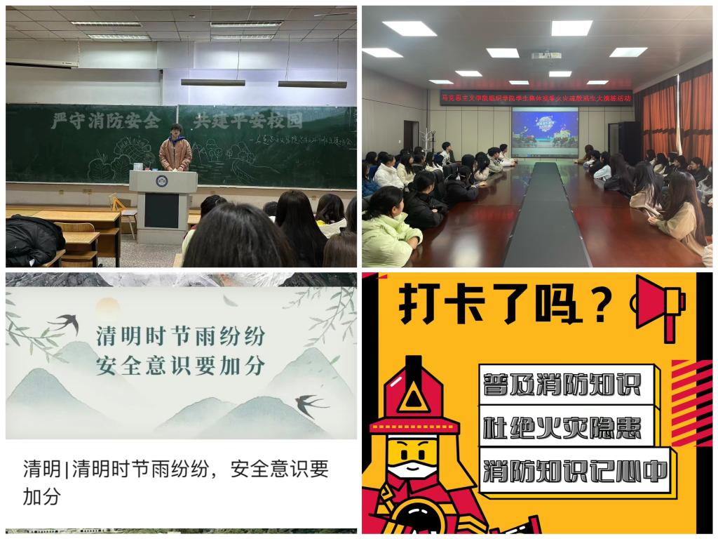 “渗透式”宣传,共筑风险“防火墙”。为进一步增强学生消防安全意识,提高学生火灾预防能力,学院组织开展“春季消防安全教育”主题班会,围绕消防疏散演练、公寓禁烟、校园安全隐患排查等方面展开,线上通过班级群、“晚安打卡”等形式打通“线上+线下”宣传渠道。通过组织全体学生观看国家消防救援局、教育部联合举办的2024年春季学校防火疏散逃生演练公开课,图文并茂的课件和直观形象的视频,使学生进一步了解消防安全常识。清明假前,学院推出假期安全提示推文,真正做到“安全不放假”。学院坚持将消防安全教育落地落实落细,始终做到消防安全警钟长鸣,为构建“平安校园”稳固基础。