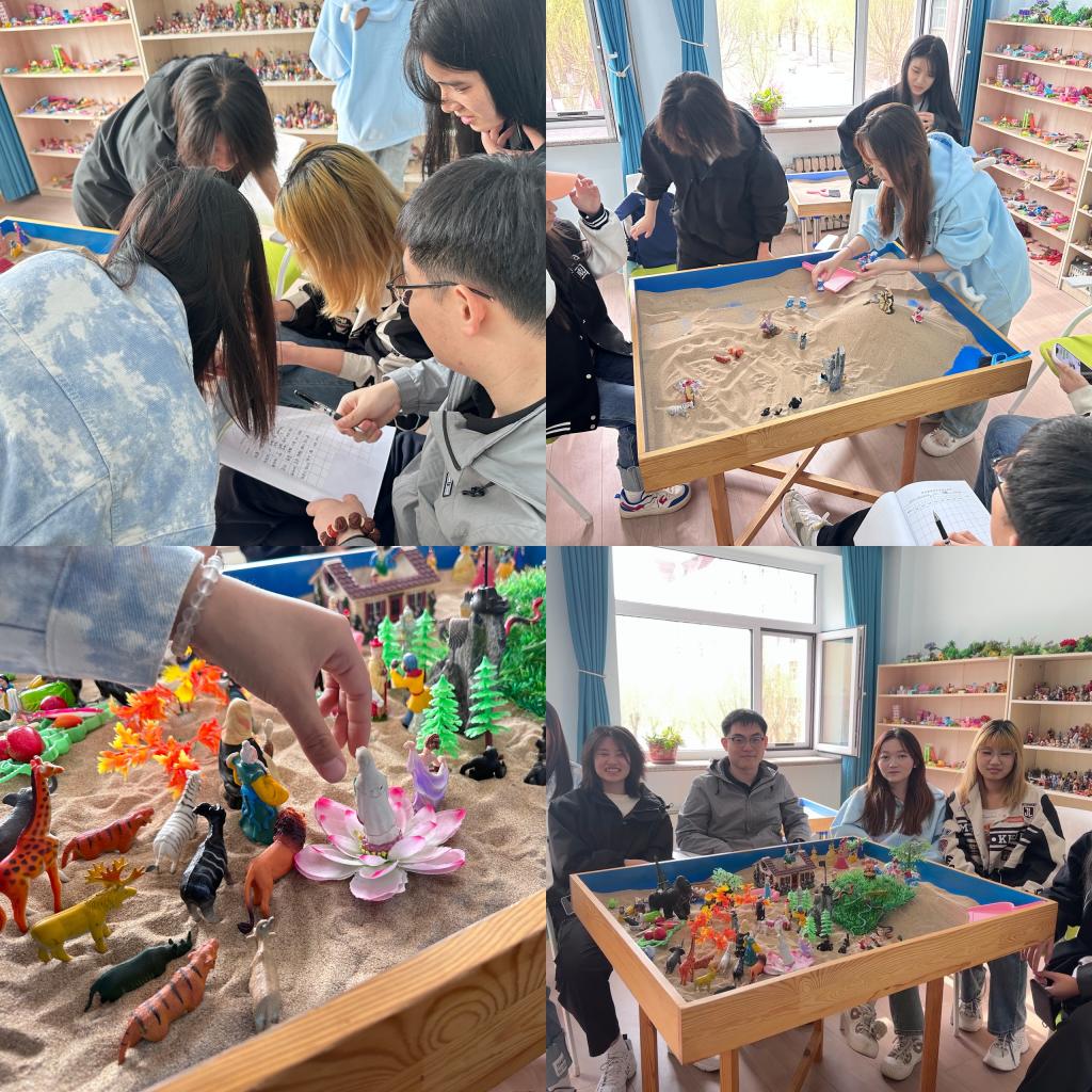 精心组织学生参加“‘沙’中世界,同‘心’同行”团体沙盘活动。由辅导员带队讲解活动的目的、流程、意义以及注意事项,参与的学生运用双手,借助沙子和沙具,共同完成一个沙盘作品。通过沙盘和玩具模型,表达语言无法表达的内心情感世界,呈现内心冲突,使得学生的不良情绪得以释放,使得团体成员在沙盘游戏中减轻压力。