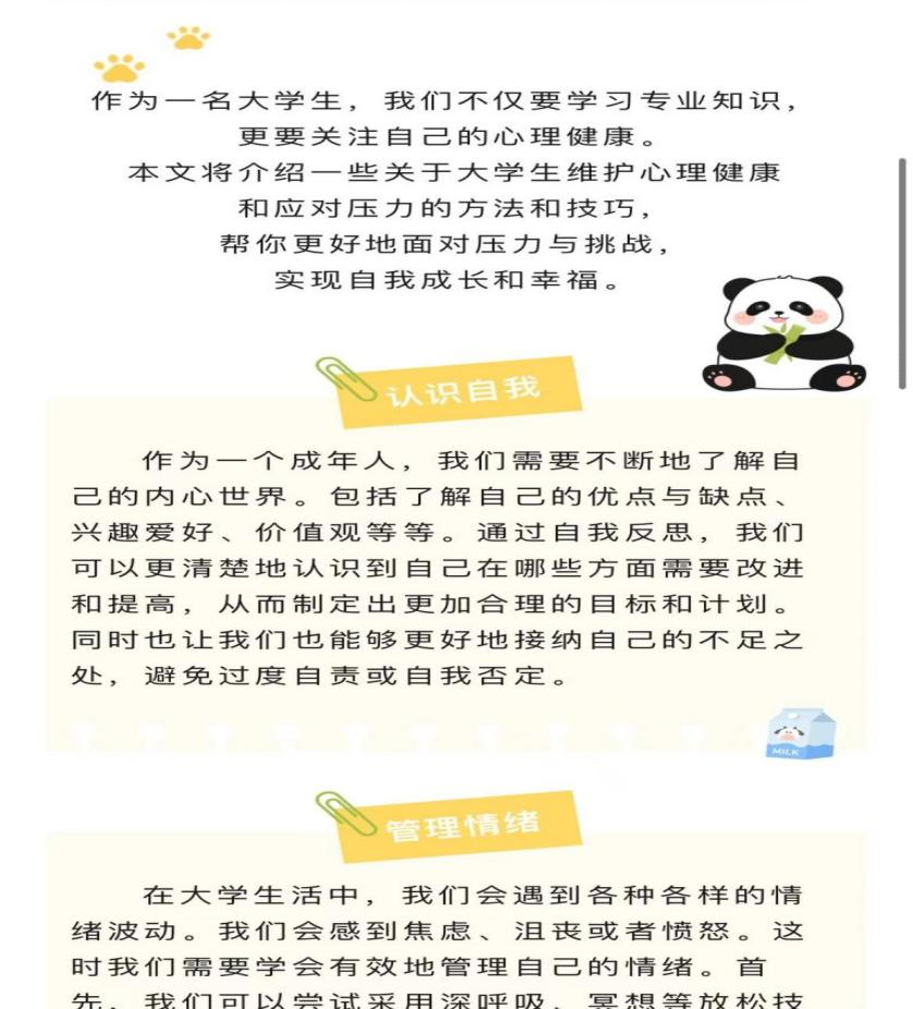 学院依托“线上+线下”等多种形式,持续推出集思想性、知识性、趣味性、服务性于一体的“5·25心科普”系列知识,引导大学生关注心理健康,增强学习动力,促进自我发展。目前线上依托学院新媒体平台推送“暖心陪伴,一路同行”1期心理健康小贴士即认识自我、管理情绪、培养积极心态。