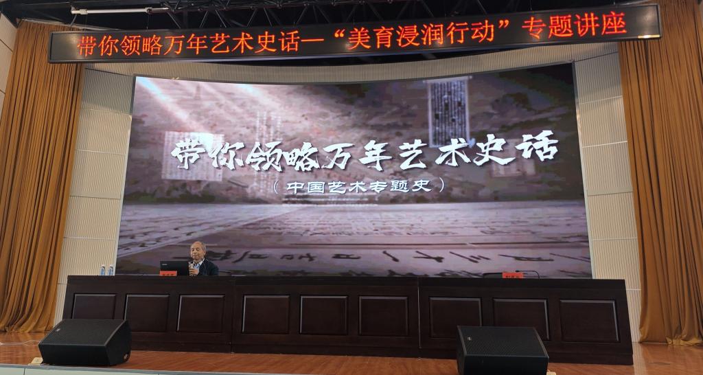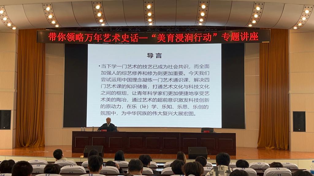 李荣有教授带领大家走进了具有高水平学术内涵的艺术殿堂,领略了他本人根据中华民族一以贯之的综合性艺术文化优秀传统,将数十个门类艺术的学科归纳为以“乐”为主体表演艺术(乐、舞、诗、戏剧等)、以“图”为表象造型艺术(绘画、雕塑、建筑、科技等)及由图像演化而成文字艺术(甲骨文、金文、碑刻、书法、诗、词、赋等)三大门类,系统论述了三者之间同根生发、本为一体的和谐架构,客观、科学、系统地引导学生们从宏观整体角度把握中国艺术发展史和艺术发展的基本规律,深度揭示了艺术文化和科技文化之间密切的内在关联。该场讲座涵盖了音乐、舞蹈、戏剧、美术、书法和文学等多个艺术学科的核心内容。不仅带领学生们深刻感受到中国艺术的独特魅力和中华民族伟大复兴的精神力量,而且激发了他们对美的热爱和追求,也引导学生们追寻探索祖国传统文化的精髓,夯实其文化自信、担负传承使命的责任感,为他们打开了通往艺术、历史和文化的新视角。