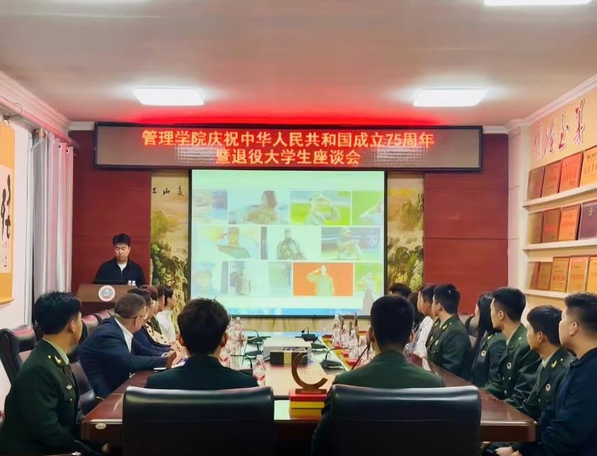为庆祝中华人民共和国成立75周年,进一步贯彻落实习近平强军思想,深入了解退役大学生的思想、学习及生活情况,扎实做好退役大学生的教育管理与服务工作,为他们搭建更广阔的发展平台,鼓励他们在校园内挺膺担当,树立青年榜样。9月28日晚,管理学院组织召开庆祝中华人民共和国成立75周年暨退役大学生座谈会,学生处处长、武装部部长邬承斌、学院党委书记何景洋、党委副书记徐海英、辅导员李东起及20余名退役大学生参加了本次座谈会,会议由徐海英主持。