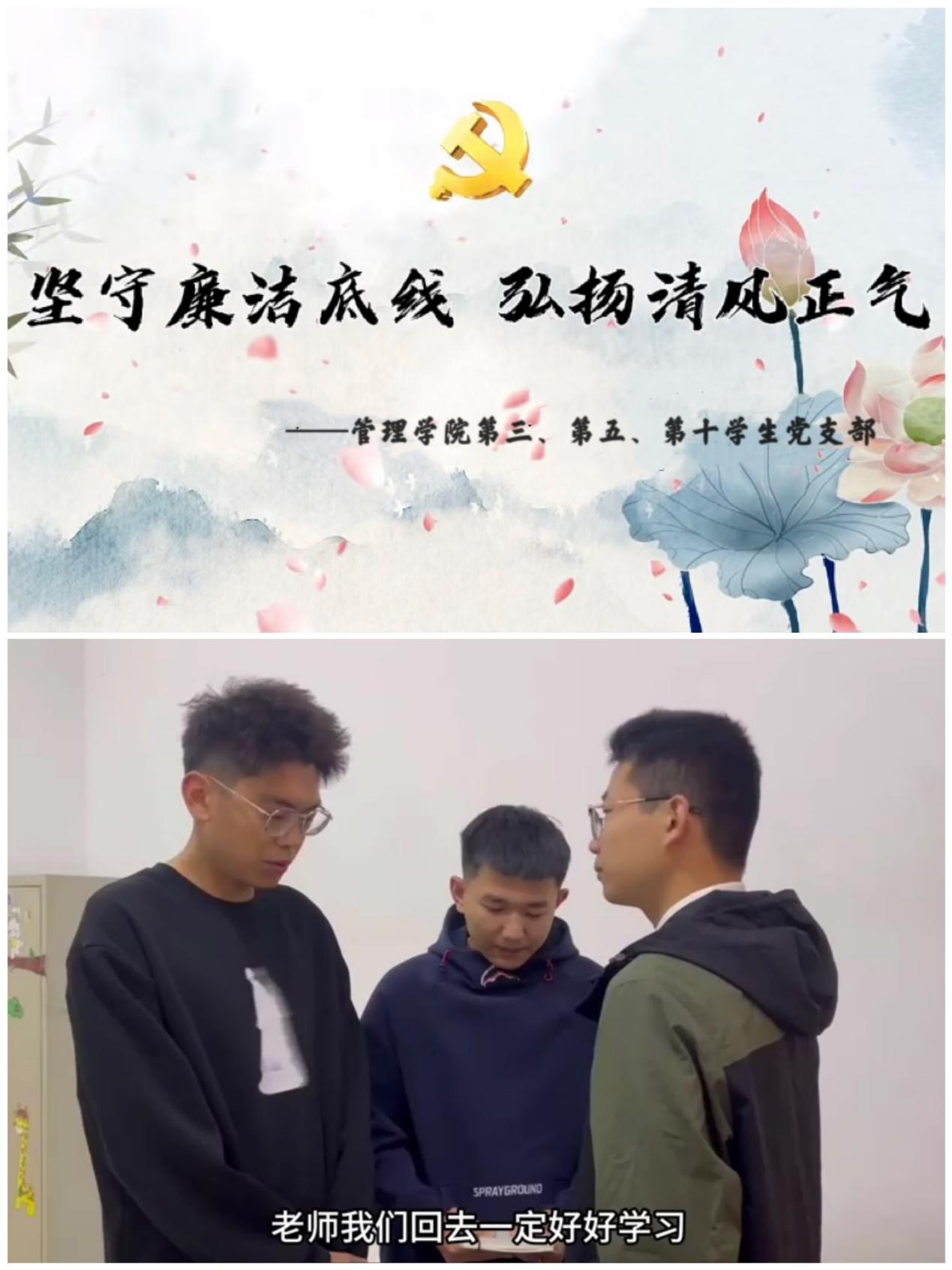 以剧喻廉,厚植清廉阵线。管理学院第三、第五、第十学生党支部以师生相处、学生交往为背景,通过脚本的创作、视频的剪辑将廉洁教育价值引导力、文化凝聚力、精神推动力融入幽默风趣的情景剧中,为落实立德树人根本任务培育壮大校园正能量。