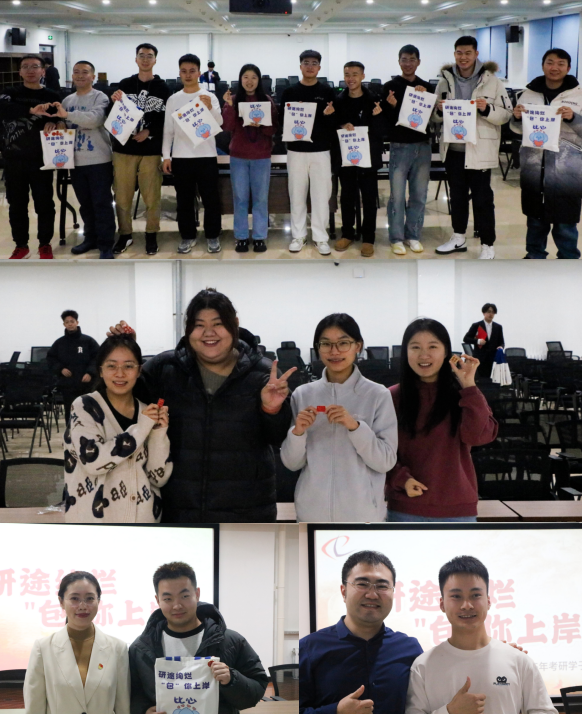 活动中,李鹏银充分肯定了考研学子四年来取得的成绩与进步,亲切地询问了复习情况以及考试心态,叮嘱同学们保持积极乐观的态度,合理安排复习时间。苏勋文向同学们讲述了当前的考研趋势、竞争形式、考试政策,从专业的角度提出考研过程中常见的问题与解决策略。侯树成从信心、坚持和方法等方面鼓励同学们坚定信念,在最后冲刺阶段要锚定目标不要气馁、不畏艰难、不惧挑战。全体辅导员代表学院为考研学子送上暖心礼包,“定制加油包”,蕴藏着学院全体师生最诚挚的祝福,“励志胸针”为考研学子提供心理能量,“未来可期笔记本”寓意用青春书写人生答卷,“彩虹糖果”代表用绚丽的味道给予鼓励,“功能饮料”为考研学子补充能量,祝福每位考生金榜题名,上岸成功。