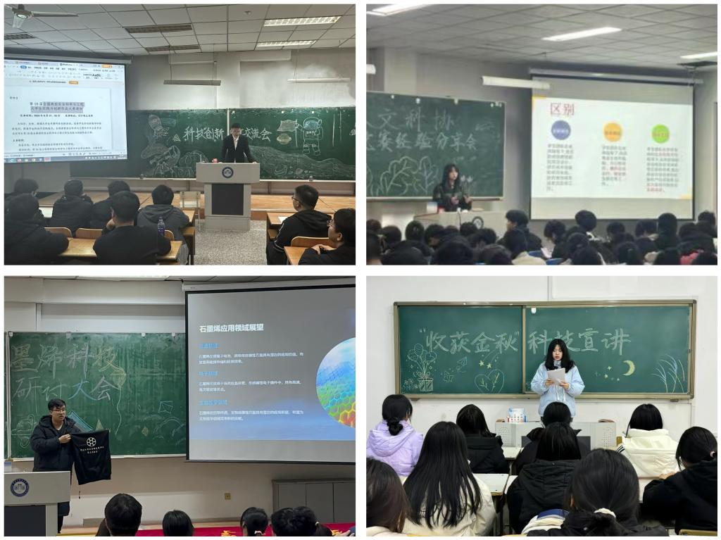 选树科创典型,分享科创经验。通过组织开展多元化经验分享会、研讨会、宣讲会,将创新创业思想融入学生学习日常。安全学院团委邀请成功推免到中国矿业大学的优秀学生典型围绕“如何参与专业科创竞赛”进行经验分享交流,提升同学们对于科技竞赛的参与热情;材料学院团委组织开展“开启未来新“烯”望”——石墨烯科技与产品发展研讨会,增强同学们对石墨烯科学的认知与兴趣;人文学院团委组织开展“激发创新活力,共筑创业梦想”双创竞赛经验分享会,以实际项目为例,为同学们提供参考思路和借鉴模式;管理学院团委开展科技宣讲,普及科创,增强同学们科技创新意识。