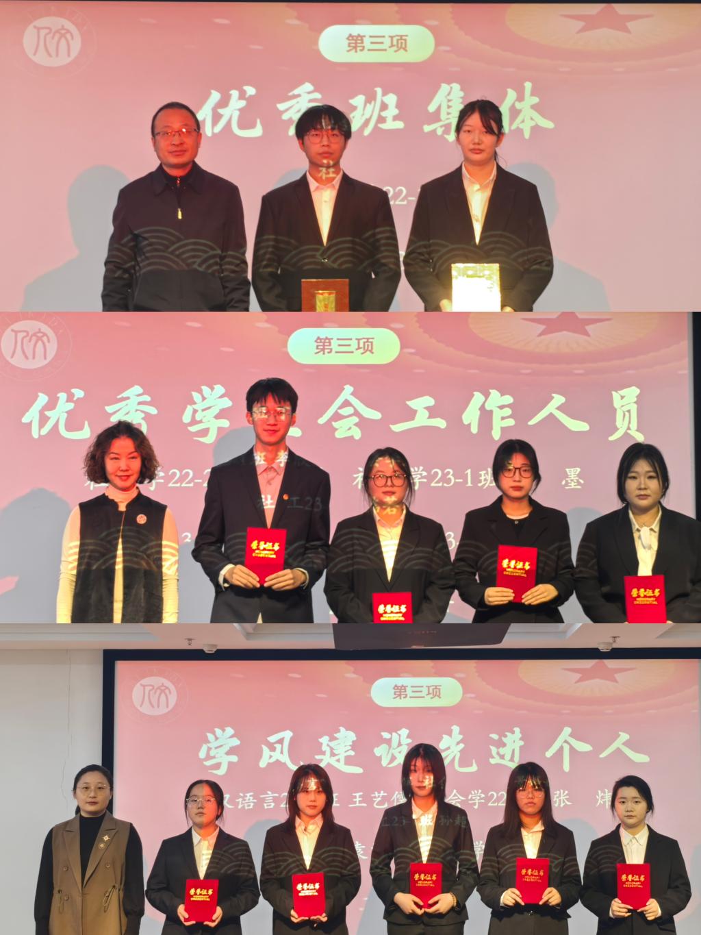 大会在庄严的国歌声中拉开帷幕。团委书记韩雪宣读了《关于表彰2024年度“优秀班集体”“优秀学生会工作人员”“学风建设先进个人”“校园文化建设先进个人”的决定》,与会领导和老师分别为受表彰的班集体和优秀个人颁发荣誉证书,先进个人代表汉语言21-2班王艺儒、社会学23-2班卢逸飞作典型经验交流。