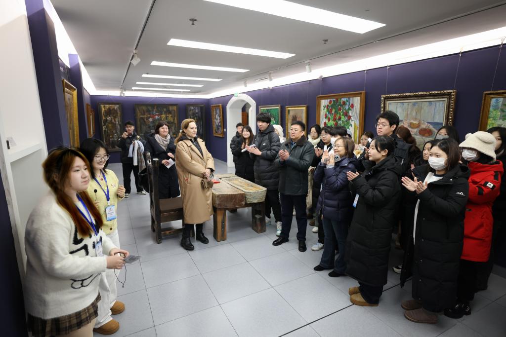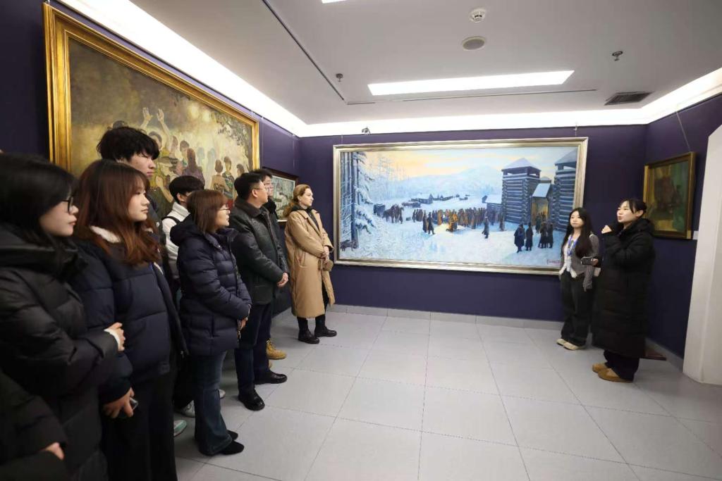 为拓宽学生文化视野,感受艺术魅力,提升审美情趣,12月3日上午,外国语学院俄语系组织2022级俄语专业53名学生赴太阳岛参观韩建民中俄油画收藏馆。俄罗斯专家米罗诺娃·亚历山大·阿纳托利耶夫娜、哈尔琴科·伊莲娜·芙拉基米罗芙娜、外国语学院党委书记张海涛、副院长曲铭欣及俄语系教师一同参加活动,活动由俄语系主任鞠传婷主持。