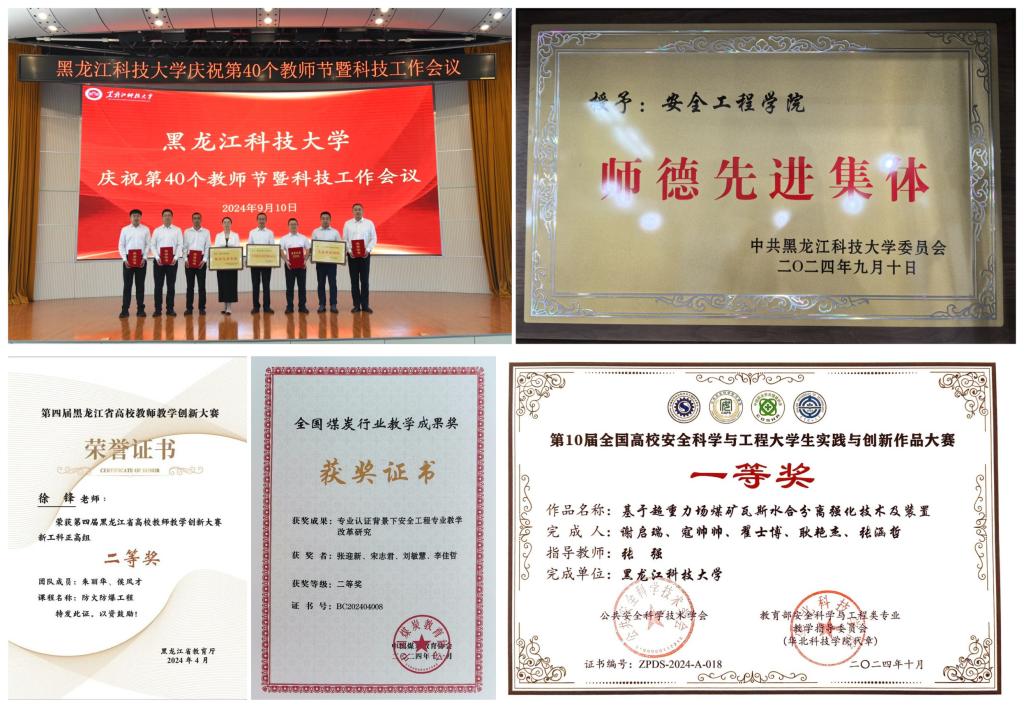 学院教师2人在全国高校安全科学与工程青年教师教学大赛及大学生实践与创新作品大赛中分别获一等奖及优秀指导教师称号;1人在黑龙江省第四届教学创新设计大赛中获新工科组二等奖;1人获全国煤炭行业教学成果奖二等奖。