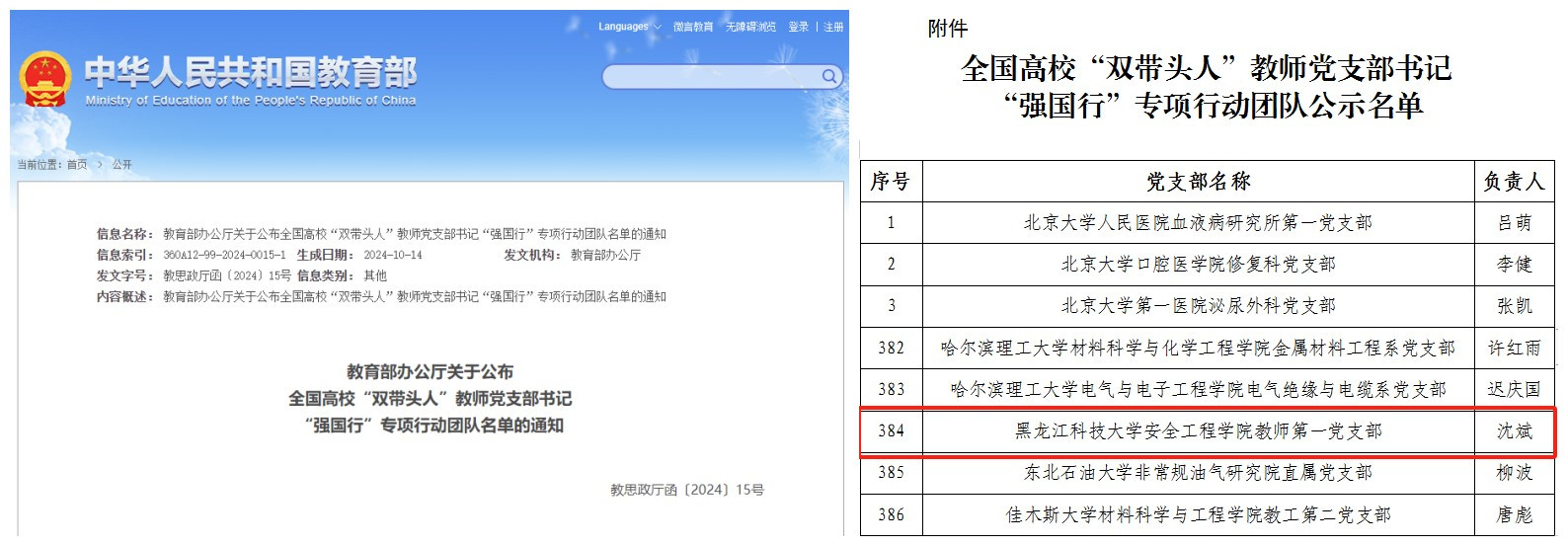 一、教师第一党支部入选教育部全国高校“双带头人”教师党支部书记“强国行”专项行动团队