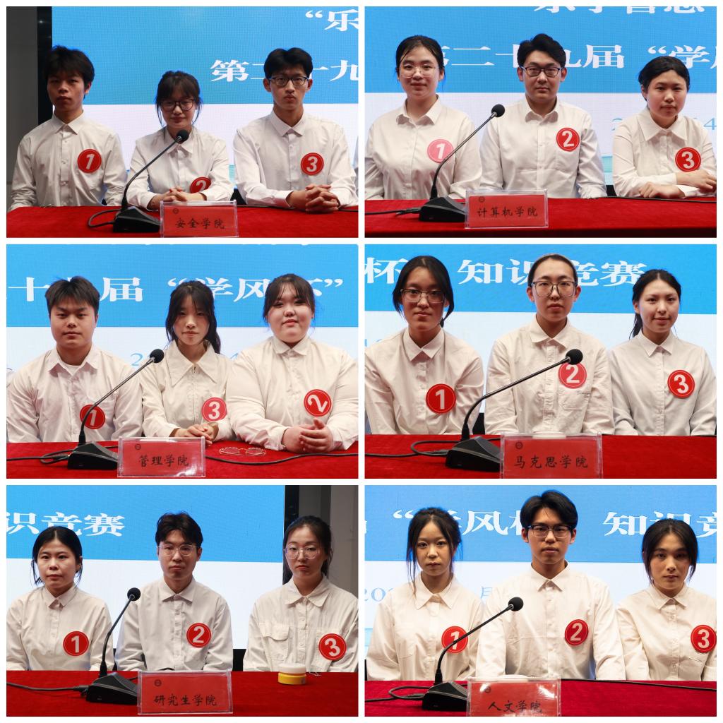 本届“学风杯”知识竞赛自3月份启动以来,各学院积极响应,组织开展了“学风杯”知识竞赛初赛,共计4000余人参与其中。经过学院初赛、学校复赛的层层选拔,安全学院、计算机学院、管理学院、人文学院、马克思主义学院、研究生学院等6支队伍脱颖而出,登上决赛舞台。