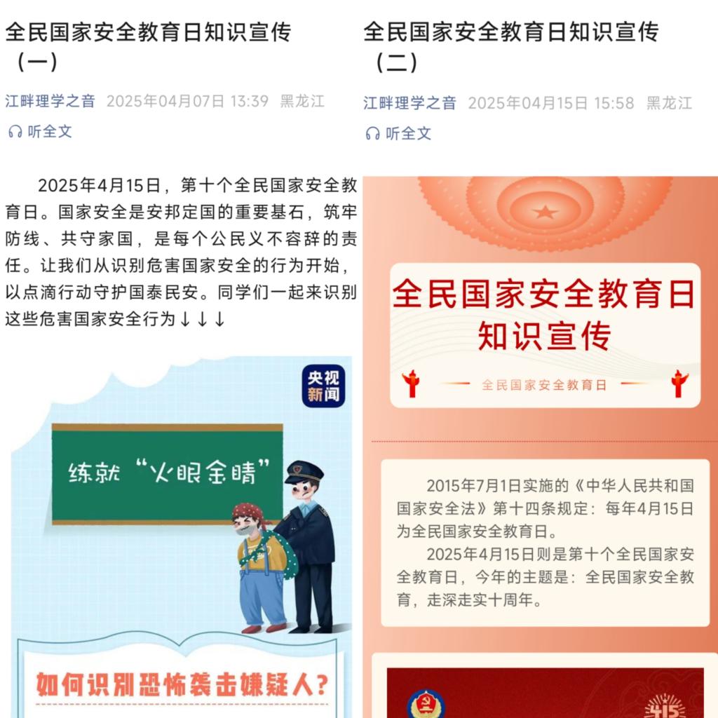 云端传播,扩大教育影响。依托微信公众号发布系列国家安全教育推文。以图文形式解读法律法规、分享安全防范技巧,实现安全教育线上线下协同推进,推动国家安全知识广泛传播。