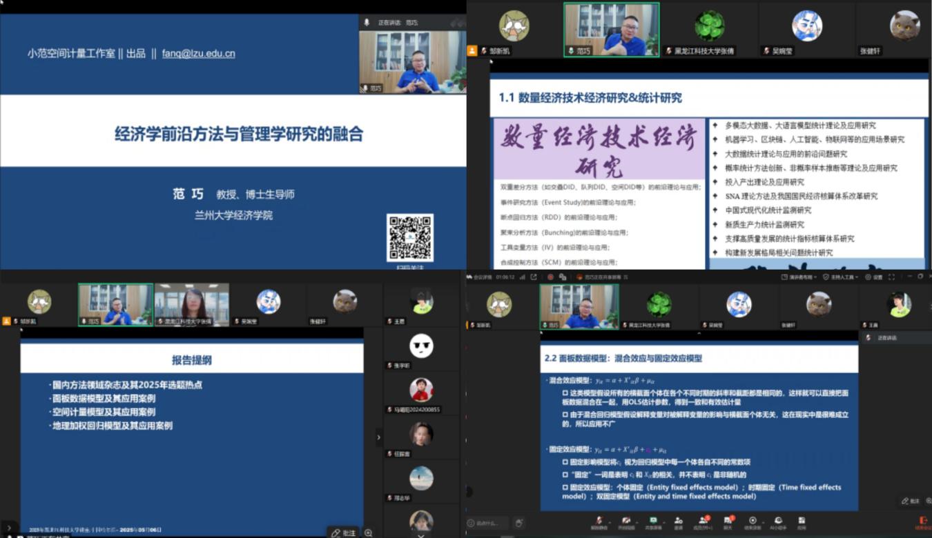 报告会上,范巧教授深入解析面板数据模型、空间计量模型与地理加权回归模型三类方法,通过生动的案例分析与理论讲解,帮助掌握这些复杂模型的核心要点。同时,以“傻瓜式”的操作步骤,手把手传授如何轻松上手先进的分析工具,有效提升管理学研究的效率与深度。