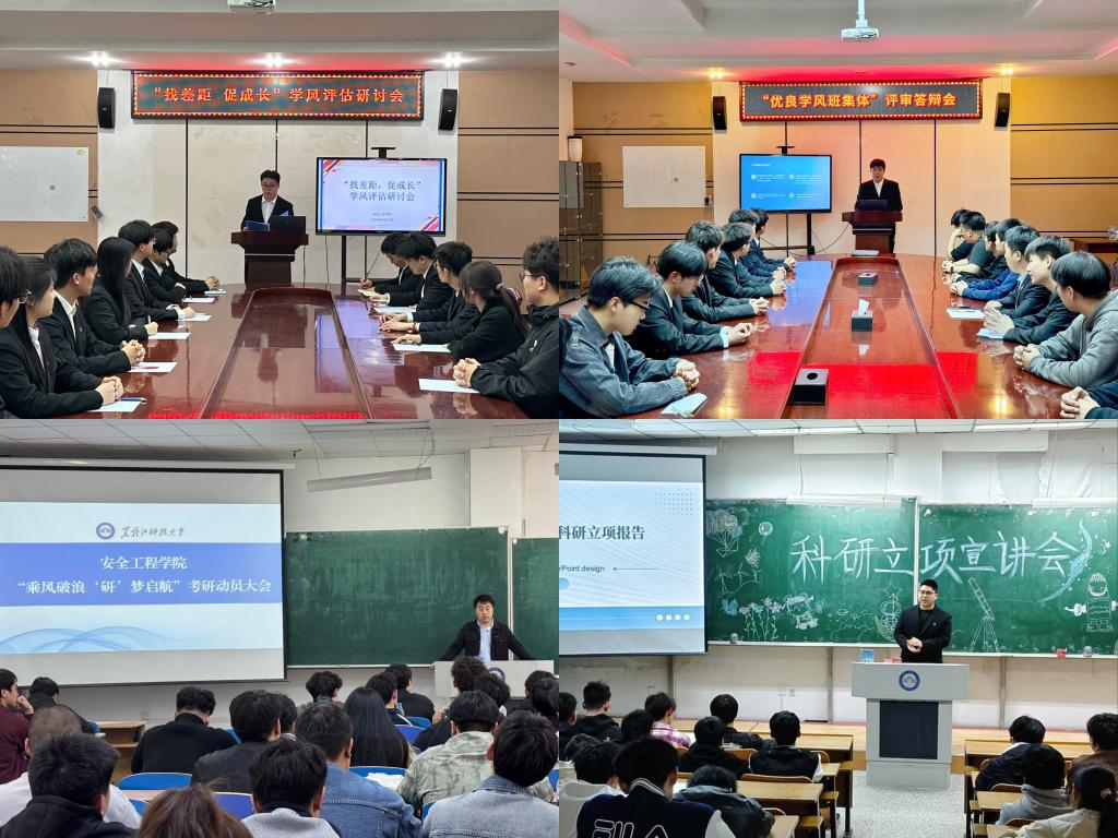 以“会”促学,凝聚奋进力量。为帮助学生明确学习目标,合理规划学业生涯,学院精心组织了2026届毕业生考研动员会、“找差距 促成长”学风评估研讨会、“优良学风班集体”评审答辩会和科研立项宣讲会。考研动员会上,帮助学生分析当前的考研形势,解读院校及专业选择要点,鼓励大家树立信心、科学备考;“找差距 促成长”学风评估研讨会通过数据展示、案例分享,全面剖析各班级学风建设情况,找出差距,为后续学风建设指明方向;“优良学风班集体”评审答辩会以展促学,通过班级特色学习规划、竞赛成果展示推动互学互鉴;科研立项宣讲会邀请优秀学长介绍科研项目申报流程、选题技巧,激发学生的科研热情。这些会议的召开,为学生提供了宝贵的信息与指导,极大地调动了安全学子学习与探索的积极性,有效提升了专业能力与综合素养。