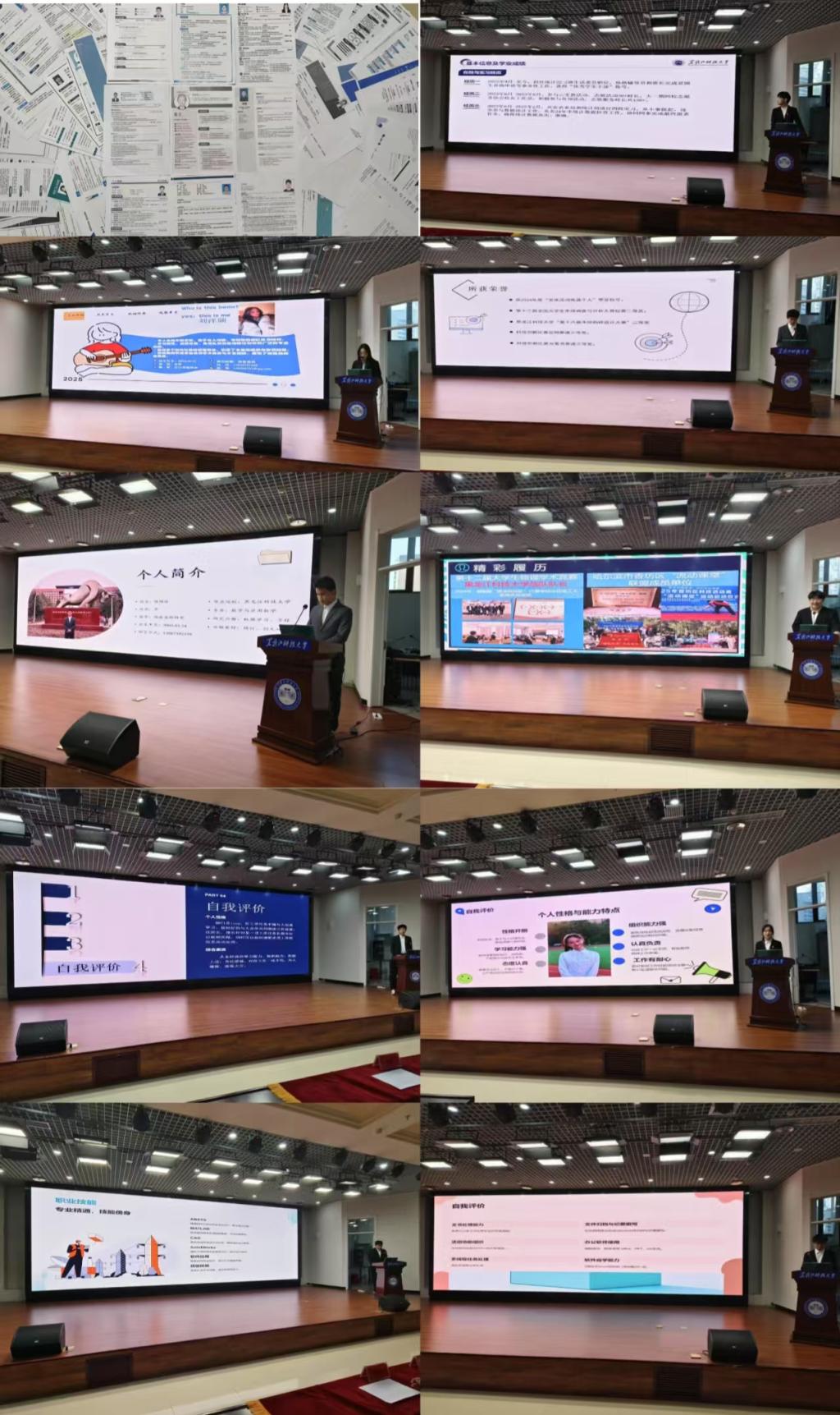本次比赛分为赛前动员、初赛、决赛暨颁奖仪式三个阶段,共有200多名同学报名参赛。经过初赛预审,9名同学的简历入围决赛,在比赛过程中,选手们在自我简介、求职目标、个人与求职目标适配性、个人未来发展规划等方面等进行陈述。评审团根据选手的个人展示及求职简历,针对选手综合表现进行打分并提出简历优化建议。