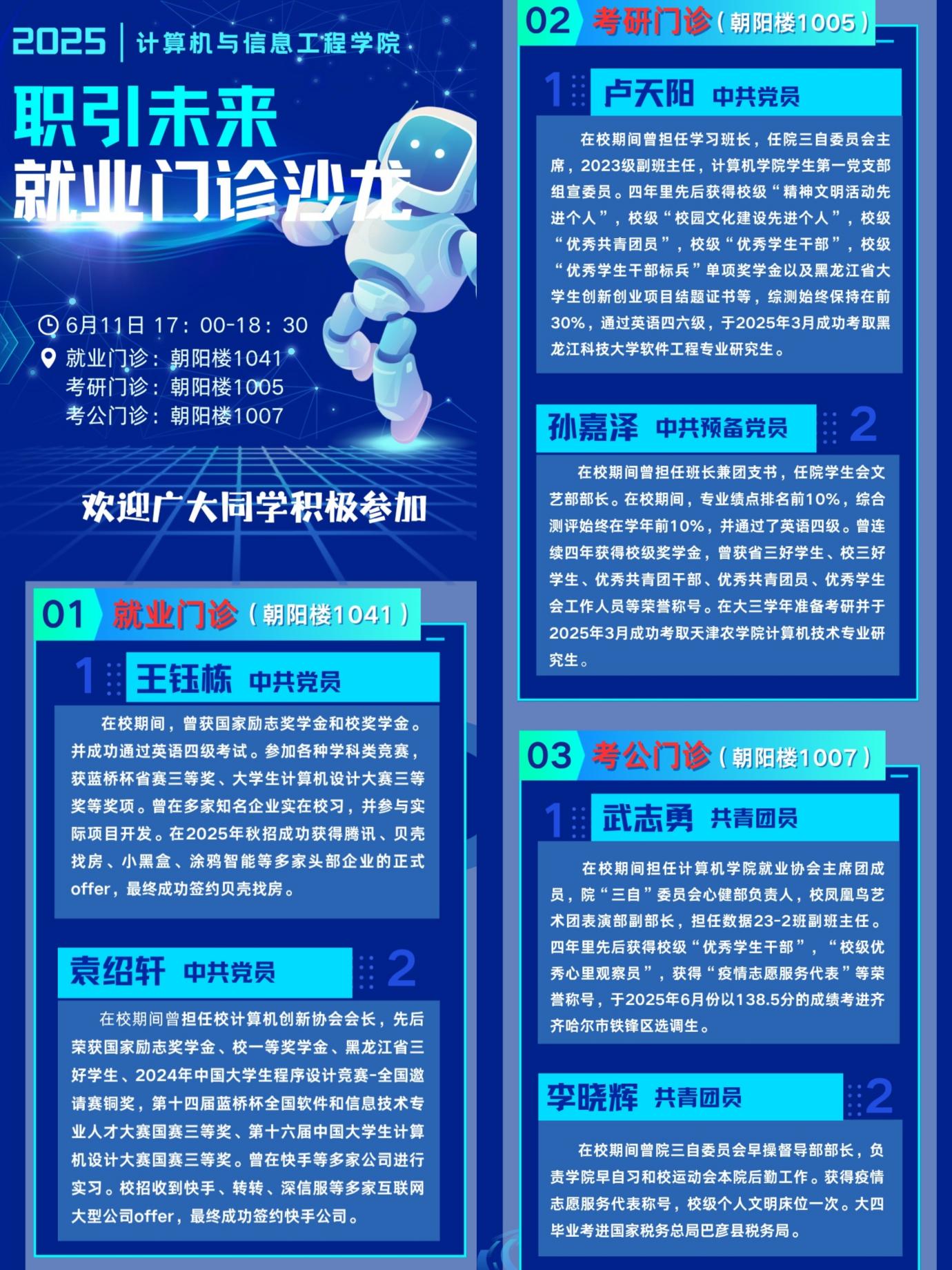 活动紧密围绕毕业生主流发展路径与学生关切问题,创新设置“就业门诊”“考研门诊”“公考门诊”三大主题分会场。计算机学院深度挖掘育人资源,精心遴选本院2025届在就业、升学、公考领域取得突出成绩的优秀毕业生担任“门诊专家”,为低年级同学提供“面对面、一对一”精准咨询与深度分享。