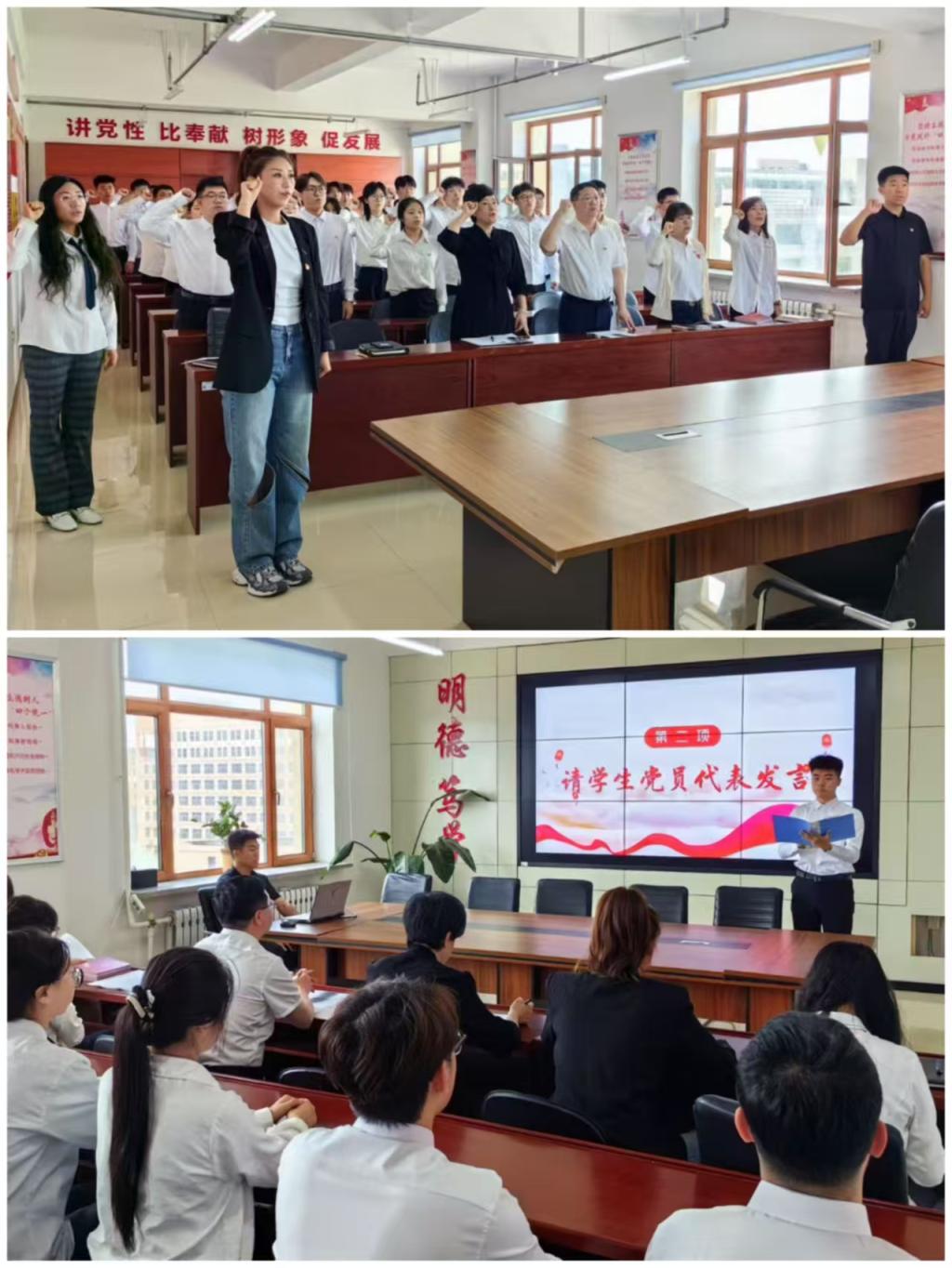 第二项通信系学生第一党支部考取鸡西市麻山区选调生宋博昊代表毕业生党员表态发言。他表示在未来的岗位上,将以真才实学服务人民,以创新创造贡献国家,做具有时代使命感和责任担当的新时代好青年,用无悔青春去书写新的辉煌。