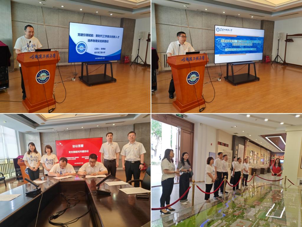 双方党支部书记张晓峻、赵国臣分别做了题为《党建引领赋能:新时代工学拔尖创新人才培养物理实验新路径》《党建铸魂聚力:新工科背景下应用型人才培养基础实验教学改革实践》的交流发言,双方党员教师展开了热烈的学习讨论。最后,双方签订了党支部结对共建协议,与会人员共同到“哈军工”纪念馆进行了参观学习。