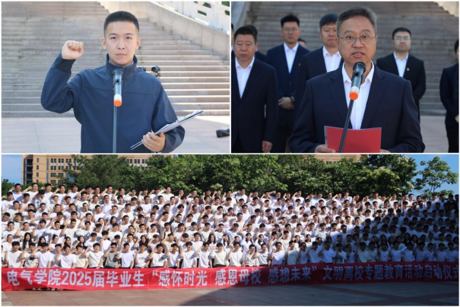 廉洁专题课、清正明志远。6月6日电气学院举行“感怀时光 感恩母校 感想未来”文明离校活动启动仪式暨廉洁从业誓师大会。学院领导、辅导员、班主任及毕业生参加。大会以庄严宣誓开场,毕业生代表宣读倡议书并领誓,展现报效祖国信念。学院党委书记李鹏银讲授思政课,提出四点期望:一要筑牢理想信念,融入国家发展;二要厚植感恩情怀,践行文明离校担当;三要锤炼慎独品格,系好廉洁从业“第一粒扣子”;四要传承电气精神,在新时代彰显担当使命。此次活动通过沉浸式教育,将思政教育延伸至离校“最后一环”,会后师生合影留念。