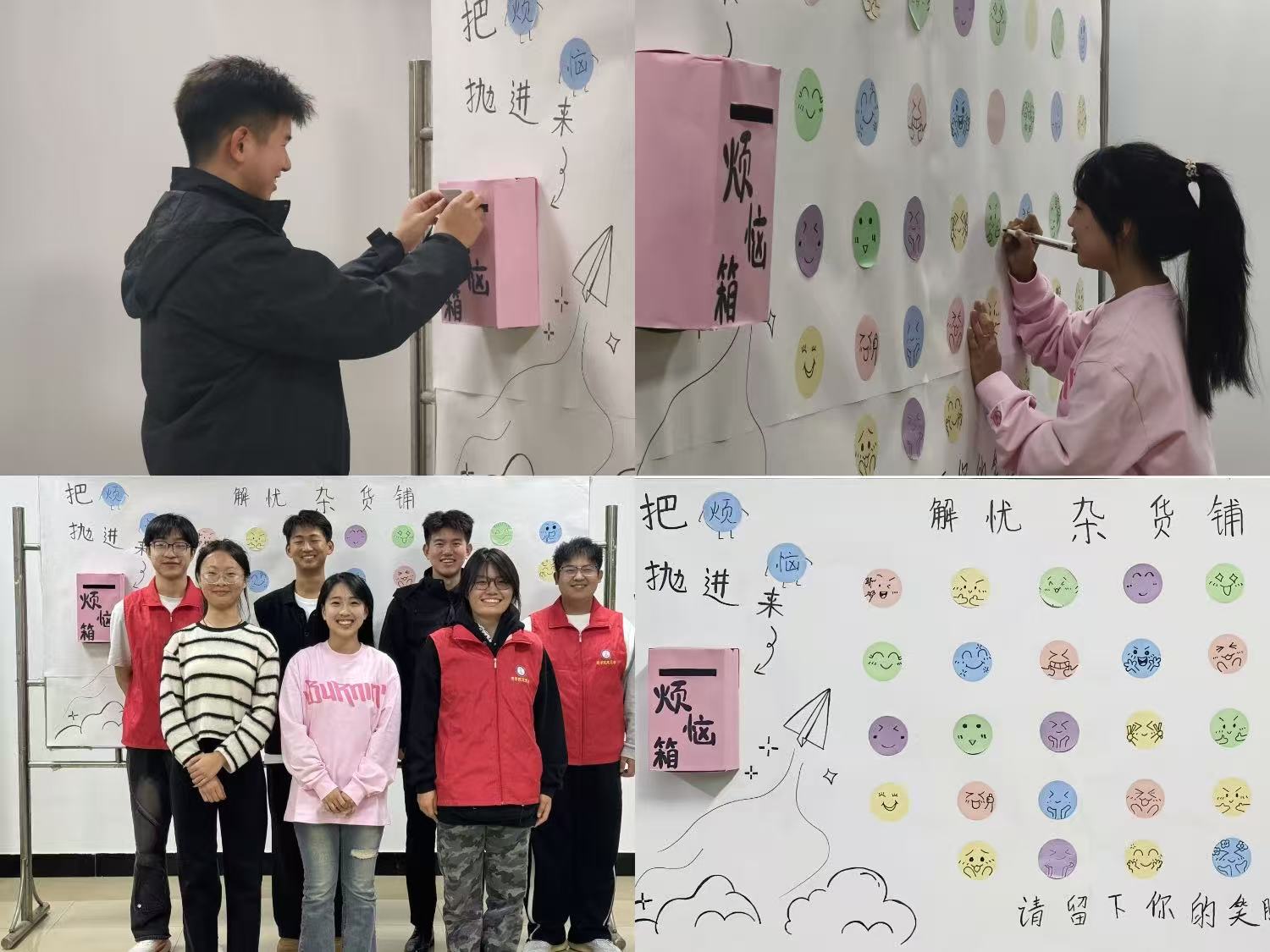打卡“解忧杂货”,解锁暖心双向。学院在“一站式”学生社区打造“解忧杂货铺”打卡点,以创意互动形式传递双向善意。同学们将烦恼写下放入“烦恼箱”,再领取空白笑脸贴纸,手绘专属表情后贴于打卡墙,让烦恼“寄存”,让小小的打卡点成为传递温暖的“心灵驿站”。
