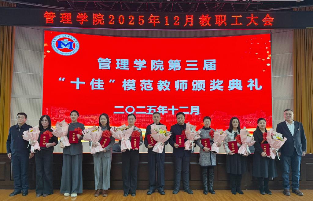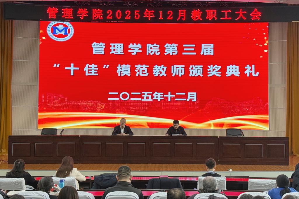 为深入学习贯彻党的二十届四中全会精神和省委十三届八次全会精神,进一步凝聚发展共识、激发奋进力量,激励全体教职工锚定教育强国建设三年行动计划,擘画“十五五”发展新蓝图,管理学院于12月24日在信息楼报告厅召开全院教职工大会暨第三届“十佳”模范教师颁奖典礼。