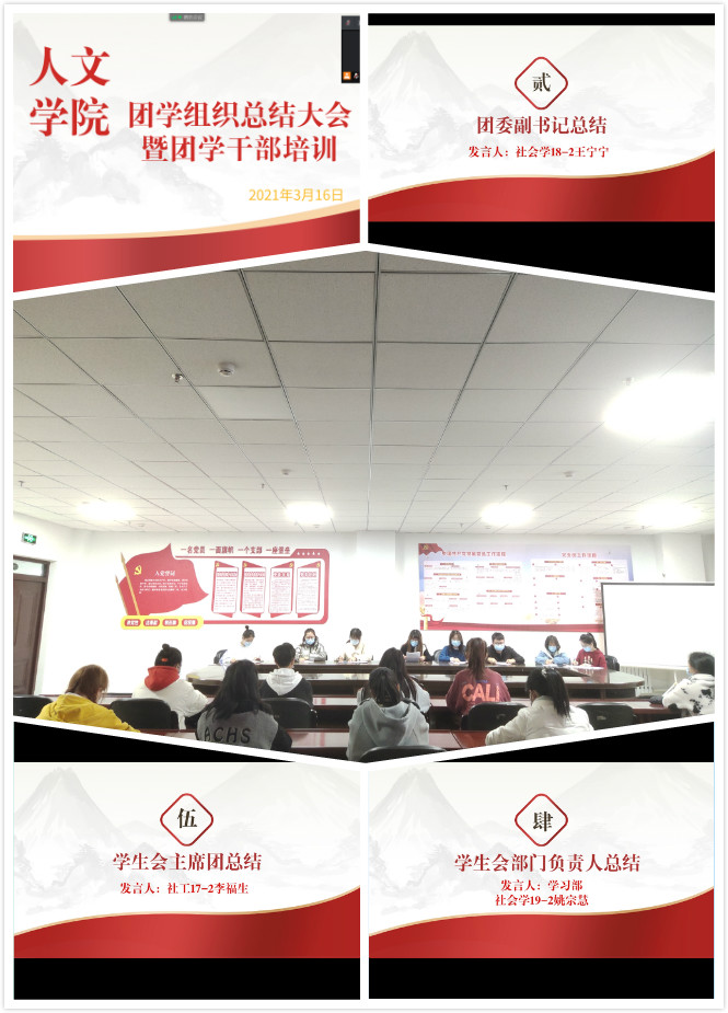 会议开始,学院团学干部代表依次对2020年的工作做汇报,介绍去年各类活动开展情况,总结了一年开展的活动并查找不足,宣读今年的工作计划。其次,各团学组织对优秀干事进行表彰,激励全体成员在实践中不断提升和完善自己。最后,团委负责人韩雪老师为团学干部进行培训,要求各成员做到以下几点:一是认清角色,担当责任,端正加入团学组织的动机,强化全心全意为同学服务的宗旨、密切联系广大同学的观念和作为学生公仆的服务意识;二是严格要求,以身作则,在日常的学习和生活中真正起到模范带头作用;三是尊重师长,注意言行,展现团学干部应有的风采;四是勤于工作,主动创新,不仅要将活动做好,还要注重彰显活动特色;五是团结协作,密切配合,切忌互相推诿,铭记团队合作的重要性。