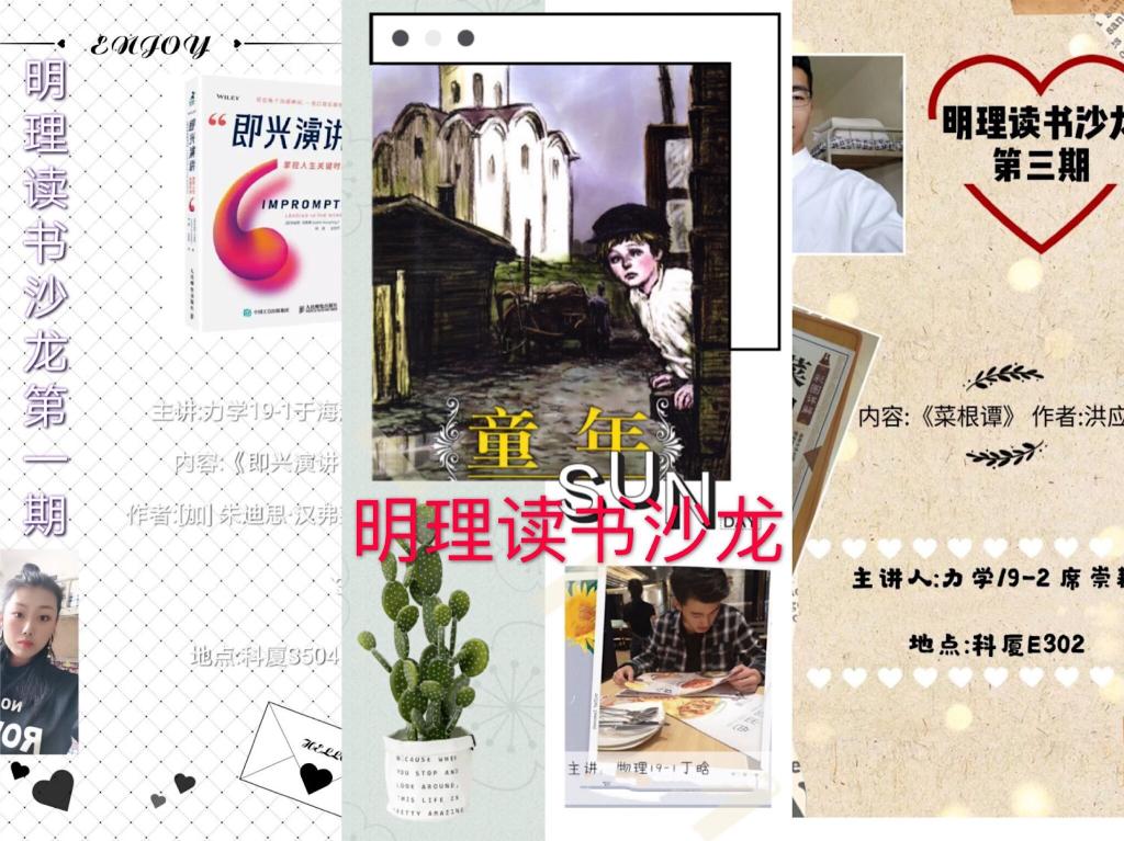 开学以来,理学院分别在教学主楼、科技大厦开展了三期“悦读青春、知书明理”读书沙龙活动。读书沙龙活动由“美文领读”、“交流读书心得”和“思想碰撞”三个环节组成。力学19-1班于海超、物理19-1班丁晗、力学19-2班席崇耕等三名同学经过前期报名、初试等环节,成为首批领读者。他们分别领读了《即兴演讲》、《童年》、《菜根谭》等三本书籍中的精彩片段;随后三名同学在交流读书心得环节中,与大家分享了读书心得,他们认为:随着时代的飞速发展,人们的沟通方式也趋向高效,即兴交流由此变得越来越重要,而“即兴”并不是临场发挥,不是不经思考地脱口而出,它和准备正式讲话一样,需要技巧也需要练习,学会即兴演讲,将带来引人注目的力量;从《童年》中“外祖母”的身上读到了“坚强”“乐观”是苦难中开出的向善花朵,指引人们向光而行,能够创造越来越美好的生活;在《菜根谭》似语录、似随笔、似训诫的简炼明隽、兼采雅俗的文字中,体会到了它对于人的正心修身、养性育德,有不可思议的潜移默化的力量。读书沙龙的最后,同学们各抒己见,分享个人对于书中人物、故事的感悟。