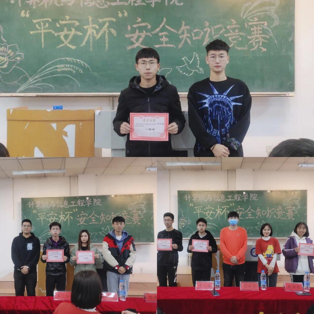本次知识竞赛共分两个环节,第一回合采取线上答题的形式,根据线上答题分数确定第二回合现场限时抢答的人选,最终按照总分选出最终名次。比赛时间40分钟,共分单选题、多选题、填空题、判断题、简答题等多种题型,多角度测试选手们安全知识掌握程度。最终,物联网20-3班刘洪伟、计科20-2班欧阳迪、张鑫羽、计科20-3班赵燎原获得三等奖,物联网20-3班孙俊、计科20-1班柳千欢获得二等奖,物联网20-2班王琦获得一等奖,获奖选手分别获得了学院为其准备的精美礼物。