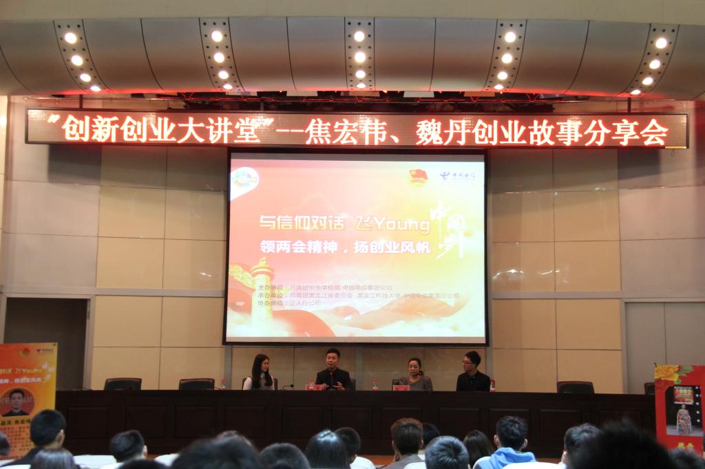 近日,李克强总理在两会上又强调“把大众创业、万众创新调动起来”。大众“创业潮”契合政府经济转型的“创新潮”,共同汇聚成一股充满活力的时代洪流。为积极引导青年学生自主创业,在大众“创业潮”中实现自身价值,成功创业、就业,3月26日晚在乐鱼网站_乐鱼(中国)信息报告大厅举办了以“领两会精神,扬创业风帆”为主题的第四十期“黑眼睛”文化沙龙。特邀黑龙江省著名青年企业家焦宏伟、智联招聘哈尔滨分公司公共关系经理魏丹来到乐鱼网站_乐鱼(中国),与青年学生一起分享奋斗经历及宝贵经验。校团委全体成员及乐鱼网站_乐鱼(中国)300余名青年学生参加了本次沙龙。