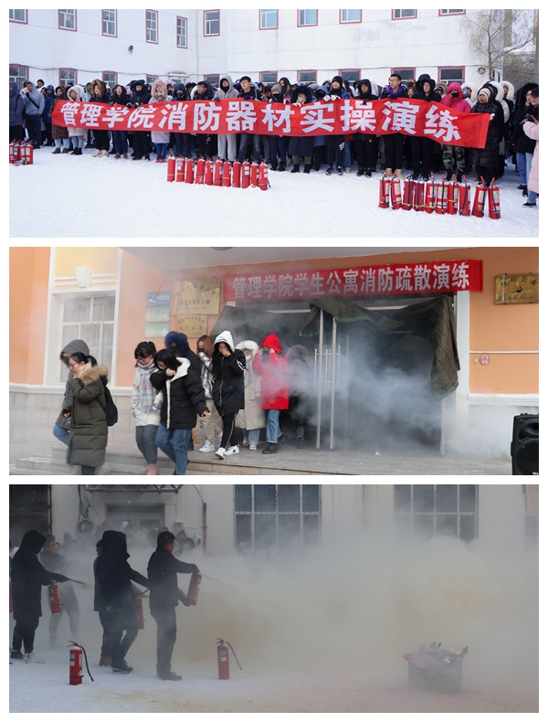 演练开始前,管理学院党委副书记张晓光简要说明演练目的和模拟情景,徐长明重点讲解了消防安全知识及发生火灾时的扑救和逃生,随后在第十七学生公寓进行了火场逃生疏散演练。演练模拟宿舍遇火情后,各岗位快速反应,工作人员立即通知值班室、启动消防应急预案,并快速打开疏散通道、组织人员有序疏散撤离及进行人员搜救。在灭火演练场,徐长明现场指导师生员工正确使用灭火器,并让师生代表使用灭火器进行灭火实践练习。