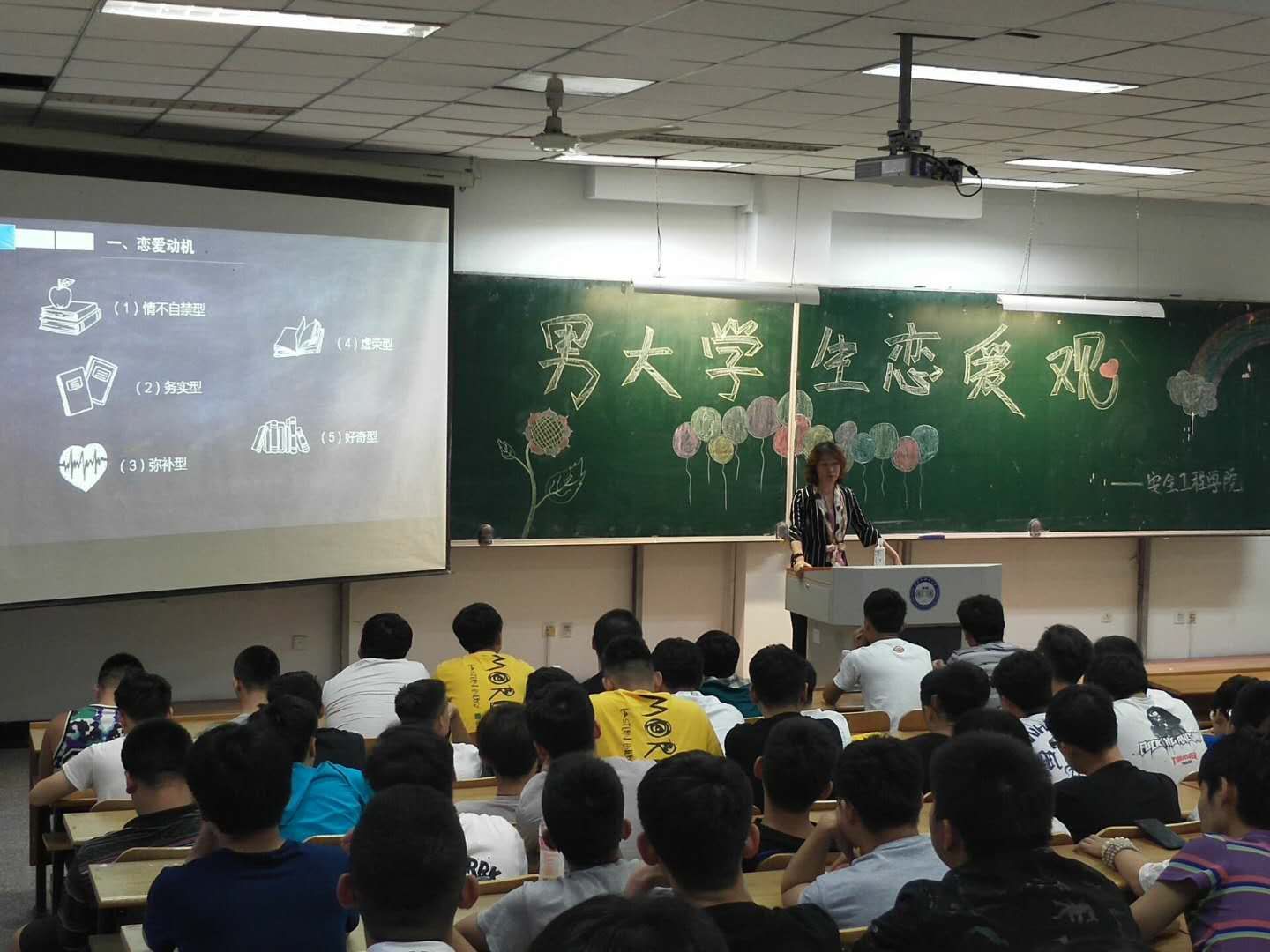 为端正大学生恋爱动机,培养正确的爱情观和价值观,安全工程学院结合本学院全部是男学生的实际情况,于6月6日晚在科厦N101教室举办了大学生恋爱观专题讲座。学院2016和2017年级全体学生参加。讲座由国家二级心理咨询师、安全工程学院学工办主任杨凤娟主讲。