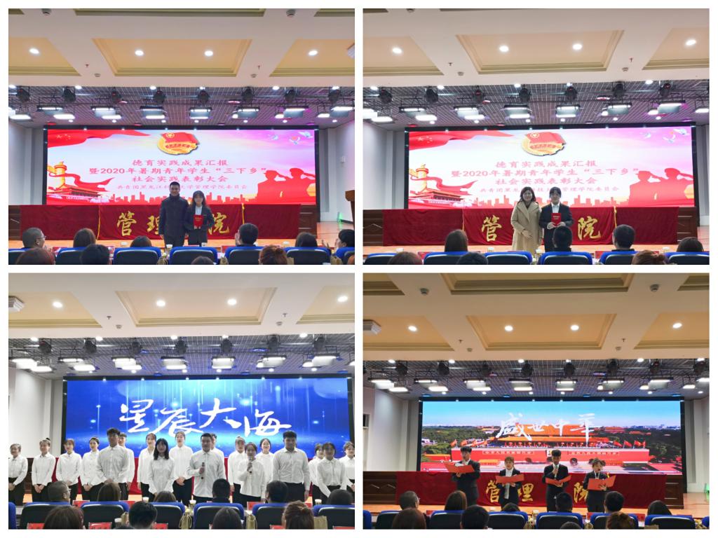 10月29日,管理学院在新综合楼0131报告厅召开德育实践成果汇报暨2020年暑期青年学生“三下乡”社会实践表彰大会。校团委副书记马紫微、管理学院党委副书记张晓光、管理学院学工办全体辅导员、各兄弟学院团委副书记以及学院主要团学干部参加了本次大会。