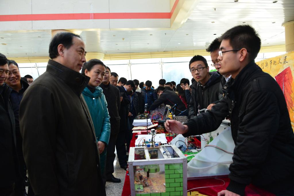 矿业工程学院学生实践获奖作品《底部移动式水平煤仓演示模型》、机械工程学院科技团队创新作品《四轴飞行器》、电气与控制工程学院科技创新竞赛获奖作品《仿生机械人》、建筑工程学院科研立项优秀作品《糖厂街道路景观设计长卷》四项优秀作品代表进行了现场展示。