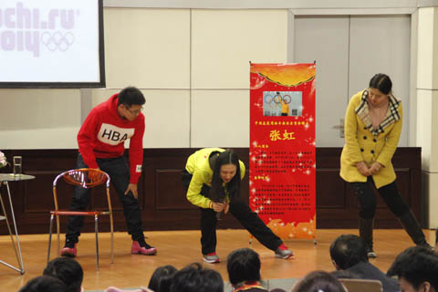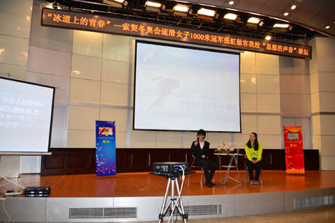 整场活动以访谈的形式进行,张虹讲述了一组组照片背后的故事,为我们讲述了自己从7岁开始滑冰,18年来不畏艰辛、奋力拼搏的故事。和我们分享了为中国夺取了冬奥会历史上的第一枚速度滑冰金牌的激动和骄傲。通过访谈的进行,在场师生真切感受到了一名运动员代表国家取得赛事最高荣誉的那份自豪,和背后所付出的磨难、艰辛与超乎常人的执着。张虹的真诚大气、阳光心态以及勇于拼搏的精神打动了在场每个人,她说“我每天、每个月、每个季度都会给自己设定一个小目标,只有做好每天的事情才会有未来”,“我很幸运在自己最困难的时候没有放弃,而是一直在坚持”,最朴实的话语道出了长期的坚守与执着。她对同学们说一定要珍惜在校的每一天,珍惜这么好的学习环境,现在的每一个积累都会为今后的成功做下铺垫。当谈及训练的枯燥和给身体带来的伤痛时,她说“既然选择了就要有责任感”,“虽然训练很痛苦,但怎样都是一天,为什么不开开心心的过呢,我就是队里的开心果”,“都说痛并快乐着,但我是累并幸福着,有追求、有目标、有梦想,才幸福”。当谈及获得索契奥运会冠军颁奖环节时,她说“看着五星红旗在最高的地方升起,内心充满了神圣感和自豪感”,她在颁奖台上行的军礼令人难以忘怀,张虹说这枚金牌的获得不只属于她一个人,而是属于所有前辈、所有速滑队员和关心速滑事业人们。她很感恩国家、感恩大家,这种家国情怀和感恩态度令在场师生动容。