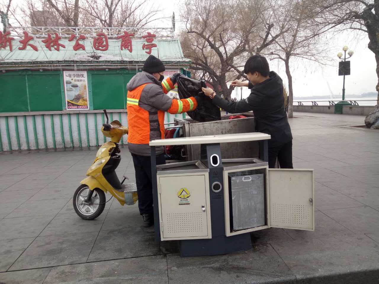 松花江江堤义务帮助环卫工人清扫