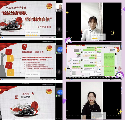本次主题示范团活庄严肃穆的共青团团歌中,拉开了帷幕,同学们在屏幕的另一端齐唱着团歌;随后线上共同观看《五四精神·传承有我》短视频,带领大家追忆并感受五四精神,传承爱国之情;汉语言19-2班李元萌、心理学18-2班顾小雪、汉语言19-2班崔奥华疫情期间志愿者典型事迹分享,诠释了团员青年所肩负着的责任,展现了团员青年的担当和力量;诗朗诵《写给未来的你》及歌曲《我和我的祖国》充分显现了人文学子热爱祖国、积极向上的精神风貌;在团员代表的带领下重温入团誓词,重温宣誓时的那一份坚定,激发作为共青团员的光荣感和使命感;最后,学院团委负责人韩雪老师对本次团活进行总结,希望广大人文学子把握五四精神的核心与实质,在贡献青春力量的同时积极响应国家号召,坚决贯彻落实学校及学院相关工作安排,积极配合疫情防控工作,认真进行线上学习,积极推进学院学风建设,提高自身的社会责任感,在党和人民最需要的地方绽放绚丽之花!
