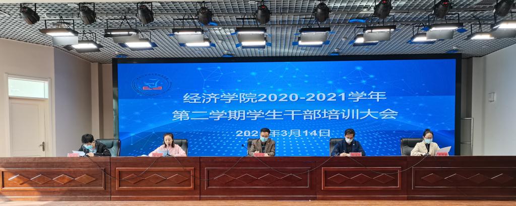 经济学院于3月14日在朝阳楼召开新学期学生干部培训大会。根据疫情防控工作要求,此次培训大会采用线上、线下相结合的形式,学院党委书记薛立刚、全体辅导员、全体团学干部参加了会议,会议由团委书记陈美玲主持。