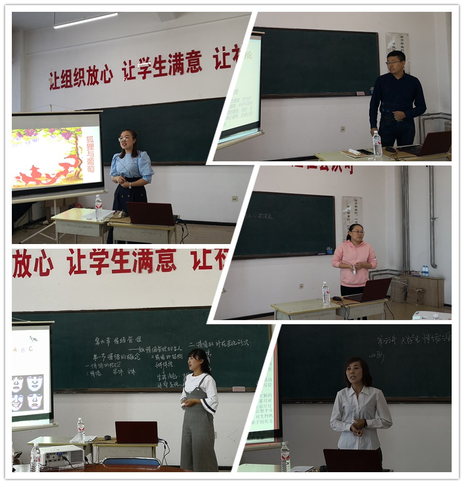 首先,申请承担《大学生心理健康教育》教学工作的梁圆圆、徐龙、张茜、高阳、陆冠楠等五名新入校教师进行了上课前的试讲。由本课程任课教师中具有多年授课经验的七名教师担任评委。经过试讲,评委们一致认为五名新教师讲课符合乐鱼网站_乐鱼(中国)课堂教学质量测评标准,讲课有热情、教学内容能够做到理论联系实际,对问题阐述思路清晰、深入浅出,可以走上讲台进行教学。