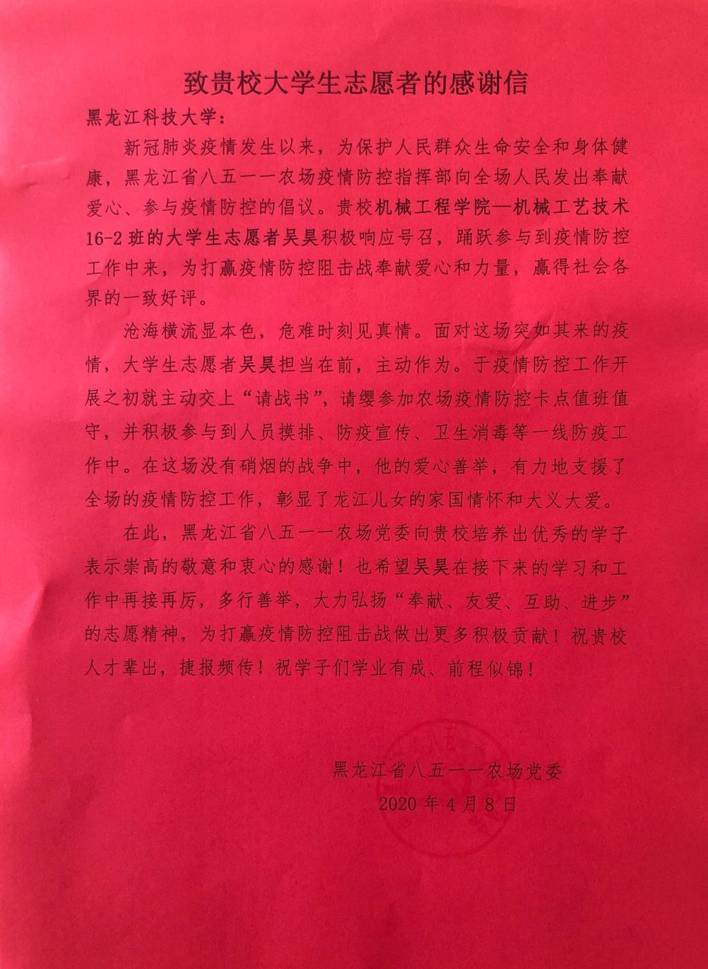 近日,乐鱼网站_乐鱼(中国)收到了一封来自黑龙江省八五一一农场党委的感谢信,信中对乐鱼网站_乐鱼(中国)机械工程学院机工16-2班吴昊同学在疫情防控中所作的工作提出表扬和感谢。