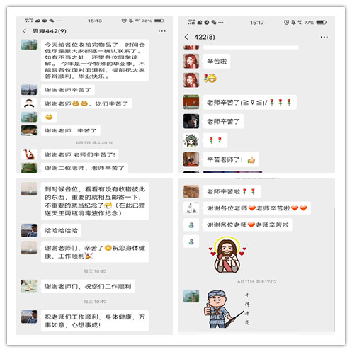 母校难忘、感谢师恩。老师们忘我无私的辛劳,换来了毕业生们深深的感动和对母校的不舍,毕业生们纷纷在微信、QQ群和朋友圈里留言,表达对母校和老师们的谢意。相信,在领导和老师们的谆谆教诲、行为示范下,学院2020届毕业生必将建功立业,大展宏图。