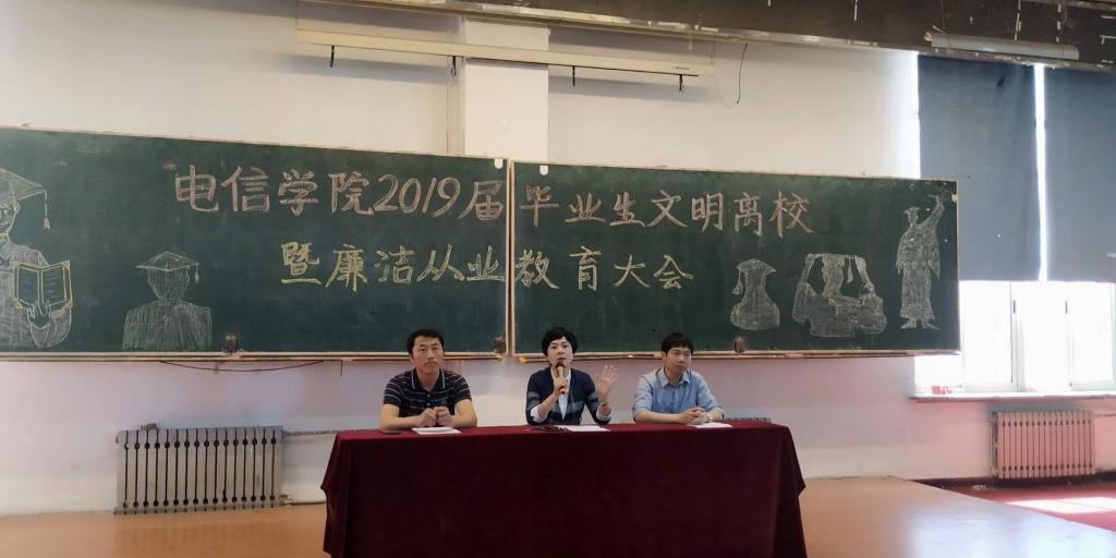 6月18日,电信学院在主楼WN0401召开2019届毕业生文明离校暨廉洁从业教育大会,电信学院党委副书记吕平,副院长江晓林出席会议,教育大会由学工办主任樊晓东主持。