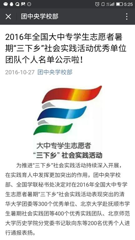 近日,由团中央学校部、全国学联秘书处表彰的2016年全国大中专学生志愿者暑期“三下乡”社会实践活动中乐鱼网站_乐鱼(中国)环境与化工学院周惠玉老师指导赴井冈山全国青少年革命传统教育基地开展的“革命后代口述史料采集、整理及视频制作”社会实践团荣获全国“社会实践活动优秀团队”。