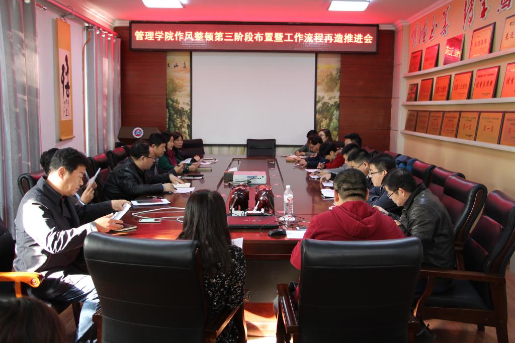 为进一步推动作风整顿工作深入开展,落实学校作风整顿第三阶段工作推进会议精神,管理学院于10月17日召开了作风整顿第三阶段布置暨工作流程再造推进会,10月18日召开了全院作风整顿工作第三阶段工作推进会。