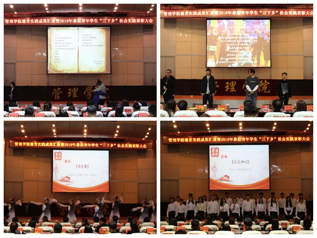 大会全程将德育教育与社会实践紧密结合,将学院分团委副书记杨晶宣读《管理学院2019年暑期社会实践总结报告》与《管理学院关于表彰2019年暑期社会实践先进集体和优秀个人的决定》,为团队与个人优秀代表颁发证书与奖品,优秀代表杨煜成、尹思萱作经验分享等环节与德育实践成果展示的《论语》节选诵读、《书简舞》、情景剧《战火中的家书》、原创说唱《江畔》、合唱《不忘初心》无缝对接。