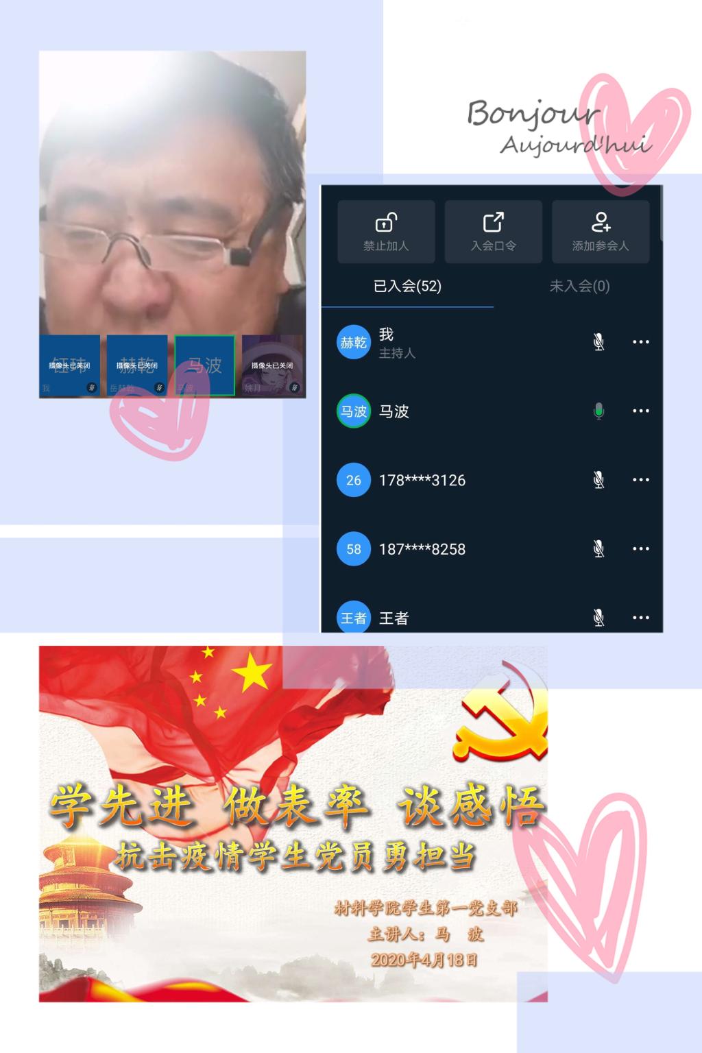 材料学院党委书记马波对学生党员提出三点要求。一是要坚定理想信念。此次疫情防控战充分彰显出中国共产党强大的执政能力,充分体现社会主义制度能够集中力量办大事的优越性,大家要继续增强“四个意识”,坚定“四个自信”,坚决做到“两个维护”;二是要积极弘扬正能量。党员同志们应发扬表率作用,学习先进事迹、感人故事,以身作则,在疫情面前防护好自身阵地的同时保卫好我院全体学生的身体与心理健康,做到脚踏实地,积极传播正能量,不信谣,不传谣;三是要勇于担当作为。继续深化推进材料学院寝室党员负责制,同志们要以“越是艰险越向前,不破楼兰终不还”的无畏精神,积极配合学院开展疫情防控相关工作,充分发挥一名党员就是一面旗帜的作用,勇挑重担,做到守护有责、守土尽责。